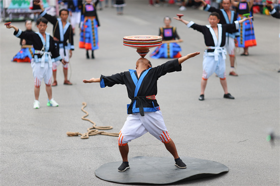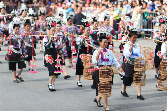 9月20日,在贵州省丹寨县,身着传统服饰的群众在巡游展演中表演。