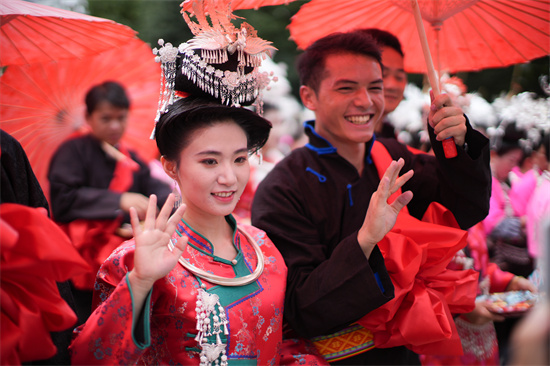 9月20日,在贵州省丹寨县,身着传统服饰的群众在巡游展演中撒“喜糖”。