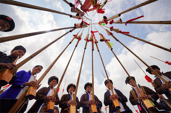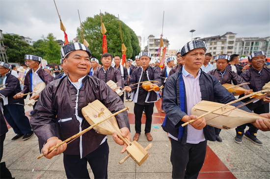 9月20日,在贵州省丹寨县,身着传统服饰的群众在巡游展演中吹奏芦笙。