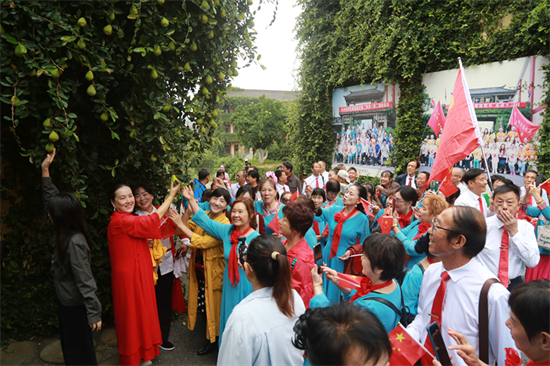 一路走来欢声笑语,生态工厂惹人醉。身着演出服装的临湘市社区星海合唱团百名学员兴致勃勃观赏“笑脸墙”、“德”字碑、天下第一坛、“爱你一万年”等别具一格的景物,情不自禁拍照打卡,载歌载舞,绽放喜悦之情。
