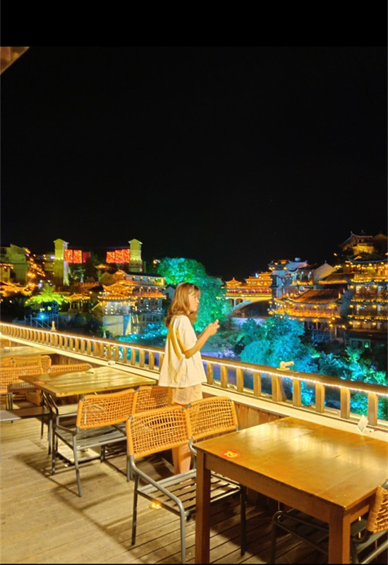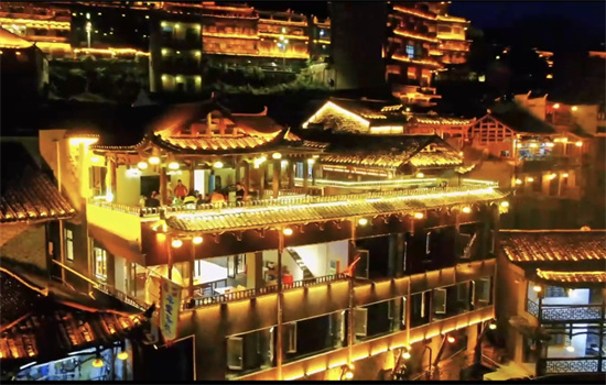 与当年的土司王行宫——酉阳宫隔溪相望,客栈左眺古朴威严的土王桥,右望山水绝美的瀑布湾。这一独特位置使住客能360度欣赏芙蓉镇夜景,尤其是黄昏时分,瀑布在灯光映照下更显迷人。