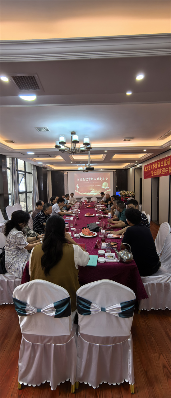 值此中华人民共和国成立75周年华诞与传统中秋佳节“双节”同庆之际,遵义市王茅酱酒文化研究会一届五次理事会暨庆国庆迎中秋文化交流会于2025年10月4日在遵义市红花岗区富华路文正大酒店隆重举行。主管部门领导、文化机构领导、研究会理事、专家学者、会员代表及特邀嘉宾30多人齐聚一堂,共商发展大计,共话文化传承,以一场别开生面的文化盛宴为佳节献礼。