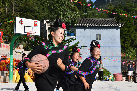 哨声刚落,穿着黑色苗装、额前发髻插着一朵红花的姑妈舅妈们立马“变身”运动员,抱着篮球乐呵呵往篮下冲。投中一个球就有人递上瓶矿泉水当“彩头”。场上跑着笑着,你抢我传;场下老人们大吹奏芦笙,唱苗歌,娃娃们追着球跑,欢呼声、笑声裹着芦笙调飘满山谷,整个牛屎寨成了欢乐的海洋。20分钟比赛结束,满头大汗的舅妈顾榜桥还意犹未尽:“托党和政府的福,咱农村日子越来越甜!头回用‘姑妈篮球赛’庆新中国76岁生日,开心得很,有意义得很!”