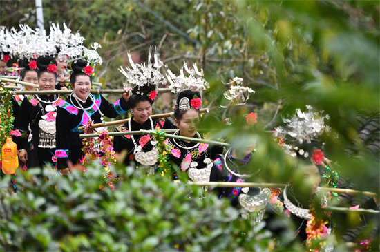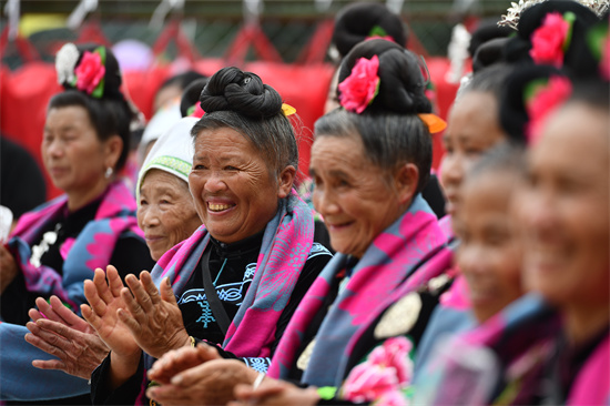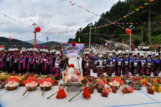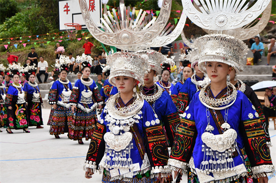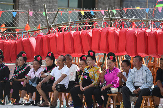 10月2日,贵州省凯里市 鸭塘街道马安村,牛屎寨姑妈回娘家参加球场修缮竣工庆典。(杨仁海 摄)