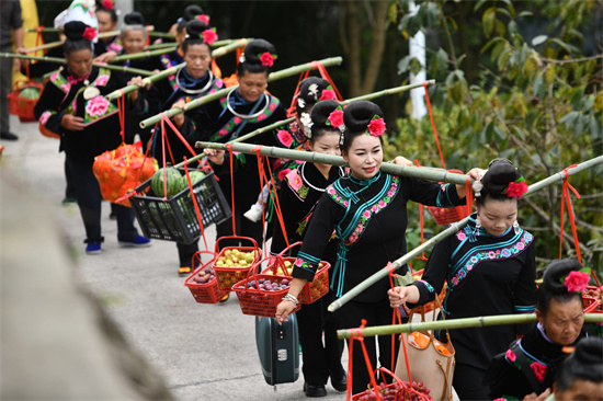 姑妈、姑爹、老表们结队抬着肥猪、挑着糯米饭、糖果饮品,却被舅舅舅妈们的盛情“堵”在两道苗家拦门酒外,唱口家乡的米酒,尝口妈妈的味道,浩浩荡荡,依次穿过寨中间公路上用青竹搭起的半圆形拱门,彩气球在绿叶间晃荡,炮声齐鸣,与苗家过年一样热闹——这个地辖鸭塘街道马安村、只有50余户人家的苗寨,正借着球场修缮竣工的喜事儿,头一回邀外嫁的姑妈们回娘家,过一个别样的国庆节。