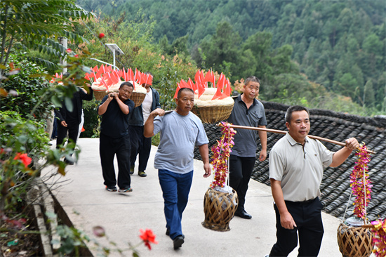 10月2日,贵州省凯里市鸭塘街道马安村,姑爹们去参加牛屎寨球场修缮竣工庆典。(杨仁海 摄)