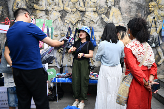 10月2日,一重庆游客(中)在贵州省凯里市绣里淘非遗集中市客串生活碎片包摊主。(杨仁海 摄)