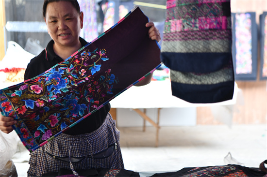 10月2日,一摊主在贵州省凯里市绣里淘非遗集中市展示苗族绣片。(杨仁海 摄)