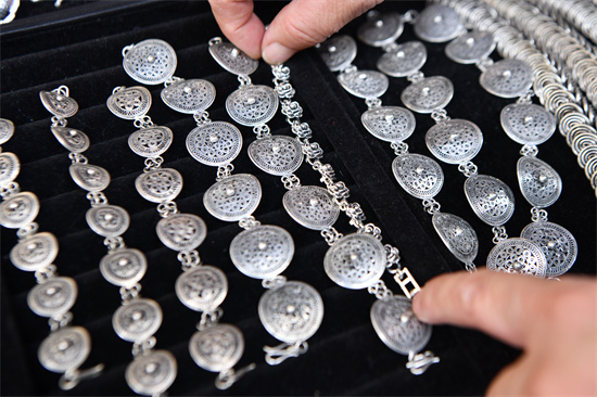 10月2日,一摊主在贵州省凯里市绣里淘非遗集中市向顾客推荐苗族银饰。(杨仁海 摄)