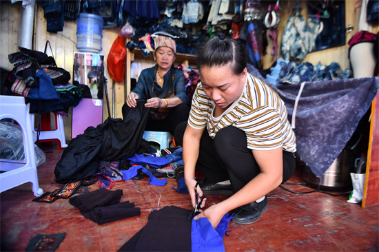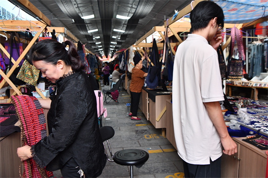 10月2日,一摊主(前)在贵州省凯里市绣里淘非遗集中市改制苗绣短裙。(杨仁海 摄)