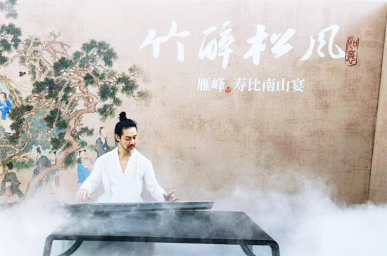 湖南雁峰酒业品牌总监张勇在品鉴会开场主持词中表示,白酒作为中华文明的瑰宝,承载着千年的历史沉淀与文化精髓。雁峰酒,把历史与文化符号融入企业文化与发展中,传递出高雅的艺术品位和上乘的品质品位。品鉴会“竹醉松风”的灵感则来自于宋徽宗的传世名画《听琴图》,营造了“松风煮酒 竹影成诗”的高雅意境,主松主干取自于祝融峰山脉,代表南岳的福,副松主干取自廻雁峰山脉,代表雁峰寺的寿,两棵松的形状像两条在南岳山脉腾飞的龙,寓意“双龙献瑞”,借此景祝各位贵宾事事如愿,福寿两全,在品味白酒的同时感受衡酒文化的独特魅力和深厚底蕴。张勇认为,一瓶好酒需要时间沉淀出精华,才能展现最为醇厚的味道。松树的特点是生长缓慢,气质高雅,这跟雁峰酒的酿造很像,雁峰是一家以“慢”为骄傲的酒厂,让窖泥自明清以来慢慢生长,形成了湖南省唯一的窖池类文物保护单位,被誉为“活着的文物”。同时,把发酵周期延长至45至60天,让纯粮糟醅和雁峰小窖全面接触,让酒香更醇厚,把优质酒体用淘坛静置在雁峰中南第一酒窖10至50年,让酒体老熟生香。这种慢文化,造就了雁峰酒“名贵陈香、醇厚舒适、健康优雅”的独特口感。