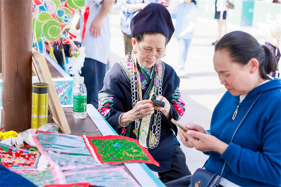 2025年苗族姊妹节苗绣技能大赛现场 游客正在体验苗绣