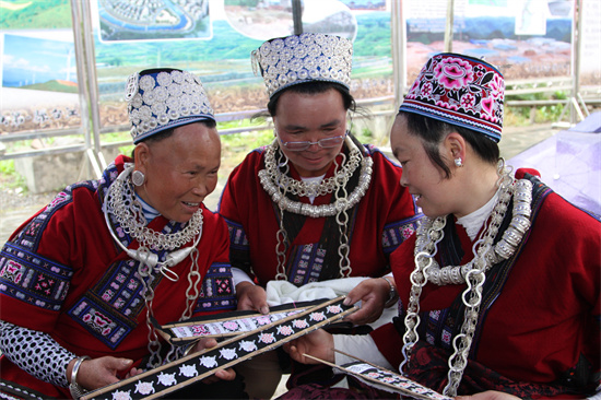 “妈妈制造”工坊的绣娘们在交流苗绣技艺