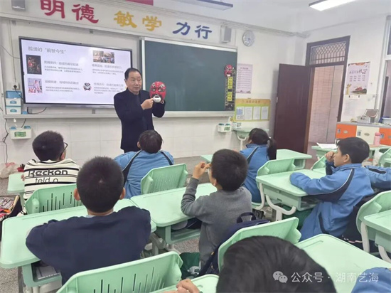 “湘剧脸谱是戏曲艺术的‘视觉密码’,红色代表忠义,白色象征奸诈,黑色寓意刚正……”在课堂上,许国章院长手持色彩斑斓的脸谱作品,用生动通俗的语言为孩子们讲解湘剧脸谱的历史渊源、色彩寓意与文化内涵。从关羽的红脸到包拯的黑脸,从孙悟空的花脸到秦桧的白脸,一个个性格鲜明的脸谱形象,让孩子们听得入迷,不时举手提问,课堂气氛十分热烈。