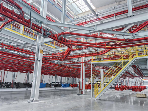 工厂的智能物流系统被工人们称为“最强大脑”。在总装区域,“空中输送+地面AGV”的立体物流模式高效运转:顶层轨道将车架、门架等大件精准送达二层平台;同时,30台地面AGV机器人根据订单优先级,灵活配送驱动桥、变速箱等各类零部件,实现“物料不落地、按需精准供应”。这背后是智能中控平台的统一调度,通过RFID扫描技术,系统能自动识别不同车型部件,并相应调整后续抛丸、喷涂等全流程工艺参数。
