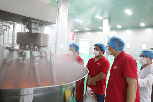 工作人员正在自动化设备旁边监测炒制酸汤温度 梁创英 摄