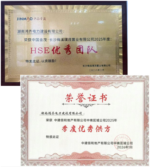 施工方面,在梅溪湖国际新城二期配电工程施工过程中,湖南鸿齐电力建设有限公司项目小组严格执行HSE(健康、安全、环境)管理体系标准,实现了安全生产与文明施工的双重目标,被授予2025年度 “HSE优秀团队” 奖。在与中建信和地产有限公司中南区域公司的合作中,凭借专业履约能力及优良的配合度,荣膺2025年度 “季度优秀供方” 称号。