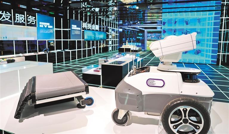 2025年12月10日,海纳数创中心重点企业成果展示现场的中邮科技股份有限公司智能快件分拣系统小车以及柔克智能科技公司变电站设备巡检机器人。徐 炜摄(中经视觉)