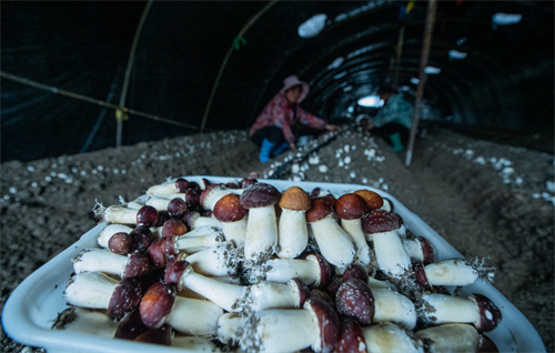春回大地,万物竞发。行走在天柱县蓝田镇的田间地头,一座座标准化菌棚错落有致,棚内一朵朵红棕色的赤松茸破土而出,圆润饱满、长势喜人。村民们提着篮筐穿梭其间,小心翼翼地将这些“土宝贝”采下,丰收的喜悦洋溢在每个人的脸上。