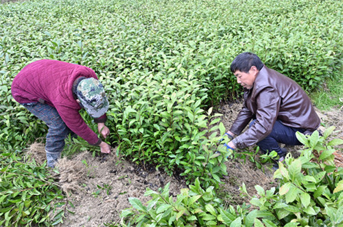 3月20日,湖南省隆回县金石桥镇黄金井村党员陈中友(右)在苗圃基地扯茶苗销售。近年,该县以“党建+合作社+基地+党员+农户”的形式,发展优质“黄金茶”系列苗木繁育,采取以奖代补等形式,免费为村民发放茶苗,为茶叶种植产业注入了新鲜活力,助力茶产业提质增效,铺就乡村振兴绿色致富路。(记者 叶亚山 通讯员 贺上升)