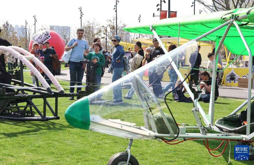 3月28日,市民游客在活动现场展示的轻型飞行器旁驻足观看。