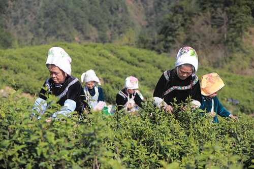 同样的丰收景象,也在排羊乡排羊村茶叶基地上演。连片的茶园里,采茶工有条不紊地采摘着鲜叶,严格遵循“一芽一叶”的采摘标准,确保茶叶品质。
