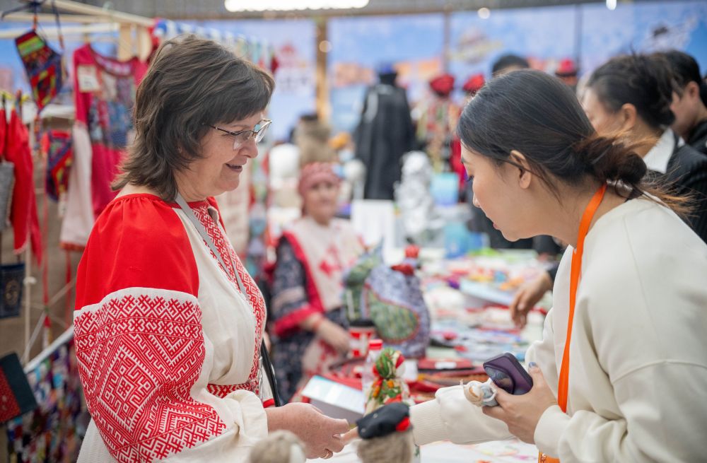 2025年12月20日,满洲里市民在一场文化交流活动中了解俄罗斯手工艺品。新华社记者 连振 摄