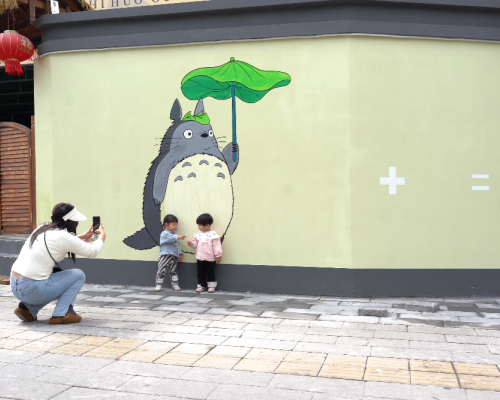 发条青、蛙老式风扇、竹蜻蜓……这些为80后、90后所熟知的童年意象被搬上墙面,与永安独具特色的笋竹元素、方言文化相互映衬,更有网红动漫形象以及互动打卡场景穿插其间。墙面不再是静态的建筑装饰,而是摇身一变,成为能够与市民、游客产生情感共鸣的“活景观”。