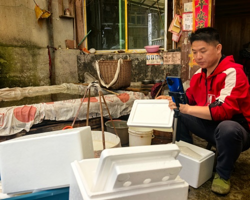 杨再银是便幌村土生土长的青年养殖户,也是村里第一个试水电商、线上销售鱼花的新农人。他十五岁跟随长辈学习传统繁育技艺,走村串户卖鱼花,在行业深耕二十余年。去年起,杨再银瞄准线上市场,在抖音、视频号等平台发布短视频,真实记录鲤鱼移池、鱼卵孵化、鱼苗过滤打包全过程,用通俗讲解展现婆洞鱼花的天然优势,让全国各地客商直观了解产品品质。