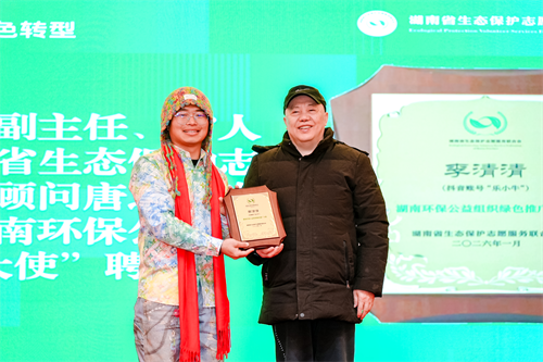 近日,以“助力经济社会发展全面绿色转型”为主题的第六届湖南绿色发展公益年会在长沙举行。年会向社会发出“争当绿色理念的传播者、绿色发展的助推者、环境治理的监督者、公众参与的动员者、自身建设的示范者”的倡议,号召全省环保社会组织共同投身绿色转型实践。湖南知名文旅博主“乐小牛”受邀担任全省环保类社会组织绿色推广大使,并与来自14个市州环保社会组织及高校环保社团代表共同发出了环保社会组织建功美丽湖南建设倡议。