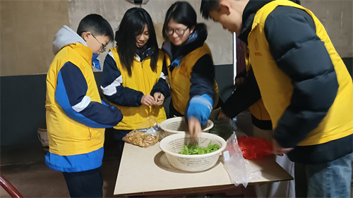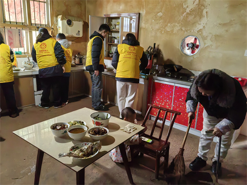 热气腾腾的菜肴摆满一大桌,大家围坐在一起提前过年,并一起举杯祝两位老人身体健康,新年快乐。吃过饭后,学生义工们主动帮忙收拾碗筷、打扫卫生,大家一起用陪伴与行动为老人送去了温暖和关怀。“家里好久没这么热闹了,”陈奶奶抹了抹眼角,“你们一来,我这心里就亮堂了。”