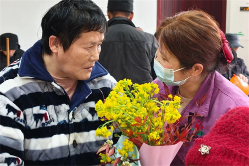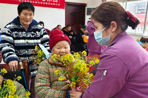 工作人员化身“花艺师”,亲手采摘春日花枝,细心包扎成一束束带着泥土芬芳的花束,把最鲜活的春意送到长者手中。接过鲜花的奶奶们笑眼弯弯,有的轻轻嗅着花香,有的拉着工作人员唠起家常,现场满是欢声笑语,暖意直接拉满。
