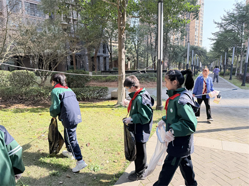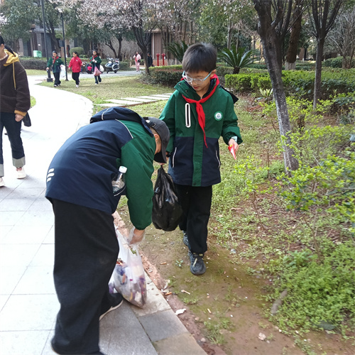 活动中,同学们身着整齐校服、佩戴鲜艳红领巾,手持垃圾夹、垃圾袋、扫帚等工具,分组对小区道路、绿化带、健身区及卫生死角进行全面清理。大家热情高涨、分工协作,不怕脏、不怕累,弯腰捡拾纸屑、塑料袋、烟头等杂物,仔细清除隐藏在草丛中的垃圾。小小身影穿梭在小区各处,用双手为环境“美颜”,成为春日里一道温暖靓丽的风景线。