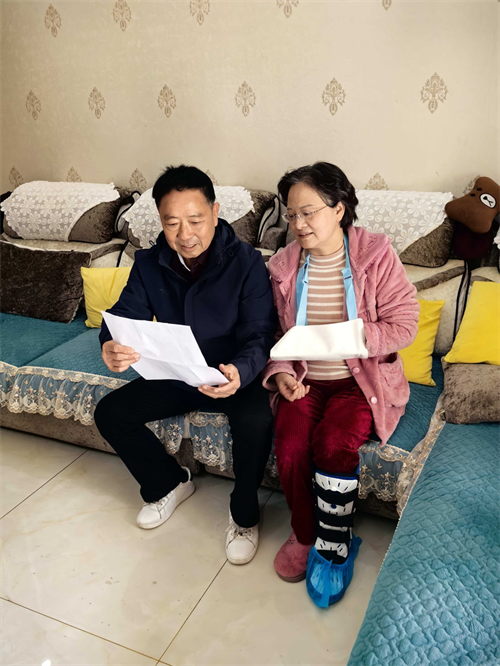 21日清晨走访慰问组一行来到滨江郦城B区4栋17-2的老党员胡定凤住处慰问。她于2026年2月7日晚上在回家路上不幸摔倒,当晚深夜送到重渝东医院,经查左桡骨远端及尺骨茎骨折,左踝关节骨折,虽然住院半月治疗,但现仍在家康养之中。胡定凤同志十分感激地说:“感谢你们来看我,感谢党组织对我的关心。”