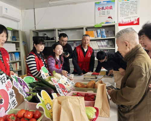 活动当天,党群服务中心里里外外都透着热闹劲儿,俨然一个“书香 + 烟火”的爱心小集市。社区提前备好的新鲜蔬菜摆得整整齐齐:红彤彤的西红柿、饱满的玉米、脆生生的黄瓜、圆滚滚的土豆,还有茄子、萝卜,都是应季的家常货,洗得干干净净,看着就招人喜欢。