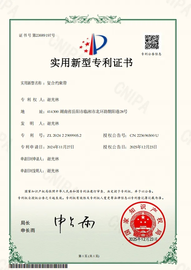 中国新报讯(魏新敏 周红)报道:近日,临湘市人民医院手术室护士长、主管护师谢光林收到了国家知识产权局向她颁发的实用新型专利证书,由她自主研发的“复合约束带”,正式获得国家知识产权局实用新型专利授权。这不仅是一项技术的突破,更是我院坚守“以患者为中心”服务理念、持续推动护理人文与科技创新深度融合的生动写照。