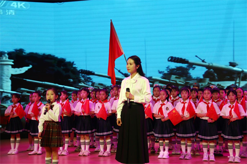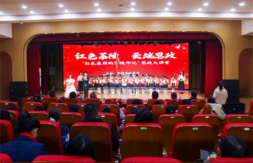 思政大讲堂在序篇《红色少年先锋队》的情景讲述中正式开启,雷依诺同学的深情演绎迅速将现场带入红色氛围。第一篇章“风起云涌”通过《茶陵少年・槐心向红》《陈美连・铁骨铮铮映山河》等主题宣讲,以具象化表达再现革命先辈的英勇事迹,让红色基因在沉浸式聆听中浸润心灵。第二篇章“抗日在茶陵”里,马子伊、马子谦姐弟讲述的《芫上惨案》,刘语萱、刘语歆姐妹分享的《军民共建小汾机场》,带领在场师生重温烽火岁月,感悟军民同心的革命力量。第三篇章“红色茶陵”中,《三姐妹的革命芳华》《将军的故乡》等红色故事分享,系统展现茶陵作为“全国首个县级红色政权诞生地”的深厚底蕴与革命传承。最后,全体与会人员起立挥舞小国旗合唱《我爱你中国》,激昂旋律中完成爱国情怀的集体抒发,将整个活动推向高潮,为大讲堂画上圆满句号。