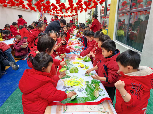 活动最吸引人的,要数那幅铺开的30米长卷。孩子们按年龄段成了小小创作团,专心致志地完成30米的新春长卷。小班的娃娃们小手捏着画笔,认真地为大大的“福”字和灯笼涂上红色,每一笔都透着稚拙的可爱;中班的孩子们玩起了创意,用切开的蔬果、柔软的泡棉印章,蘸上颜料拓出福字、灯笼和小马图案,一边印一边惊喜地发现图案的规律;大班的哥哥姐姐们则畅想未来,画纸上有穿梭的太空飞船、奇妙的高楼大厦、未来的城市,纯真的笔触里装满了对明天的想象。老师们轻轻走在他们中间,及时递上画笔、添上颜料,笑容里满是呵护。