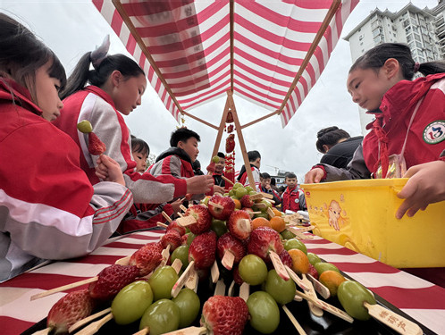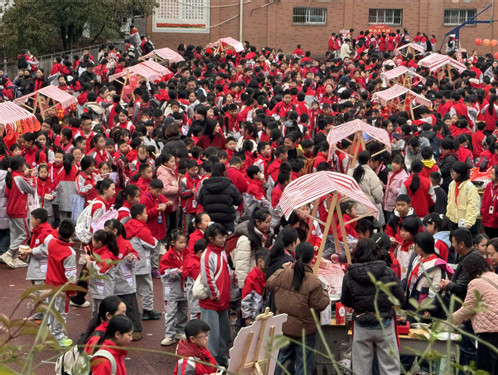 文艺演出落幕,操场摇身一变成为元宵游园集市。投壶、套圈、猜灯谜等民俗游戏趣味十足。汤圆、马打滚等特色小吃摊位琳琅满目,吆喝声、欢笑声、讨论声交织在一起,洋溢着浓浓的节日烟火气。