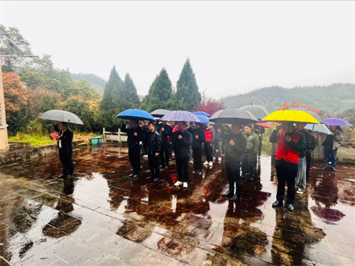 雨中的麻岭塝烈士陵园松柏苍翠,庄严肃穆。全体党员干部整齐列队,神情凝重,统一着装,胸佩党徽,怀着对革命先烈的无限敬仰之情步入陵园。
