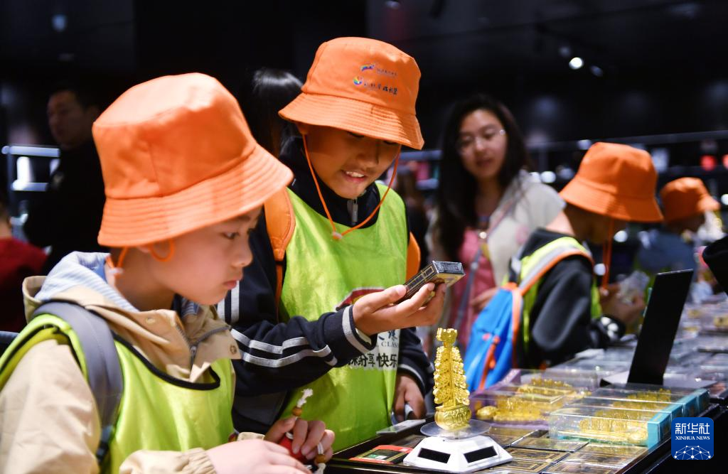 4月3日,小朋友在三星堆博物馆挑选文创纪念品。