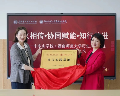 湖南师范大学是国家“211工程”重点建设高校、国家“双一流”建设高校,其历史文化学院学科实力雄厚、育人成果丰硕。长沙市一中东山学校是优质的九年一贯制学校,教育理念先进、发展起点高、育人方式勇于创新。此次共建实习基地,充分体现了两校领导共促教育发展的战略远见、深耕育人的深厚情怀与主动作为的责任担当。