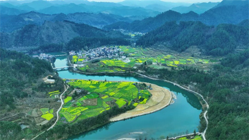 阳春三月,春风拂过苗岭,贵州省台江县万亩油菜花竞相绽放,金色的花海与蜿蜒的河流、古朴的苗寨交相辉映,铺成一幅绚丽多彩的春日画卷。
