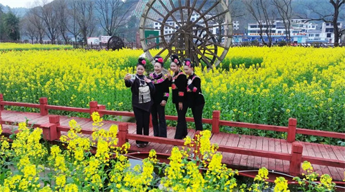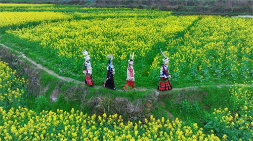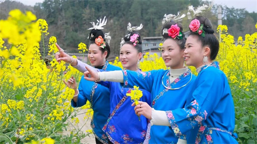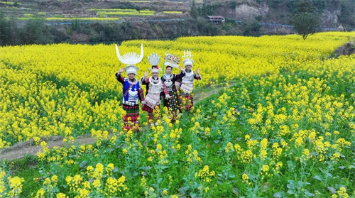 春光深处,最动人的是那一抹民族风情。在金色的油菜花海中,苗族姑娘们身着不同支系的精美服装,头戴璀璨银饰,盛装出行,色彩斑斓的盛装与金黄色的花海相互映衬,银饰叮当与苗族飞歌随着春风送往各处,向世人展示着国家级非物质文化遗产的无穷魅力。