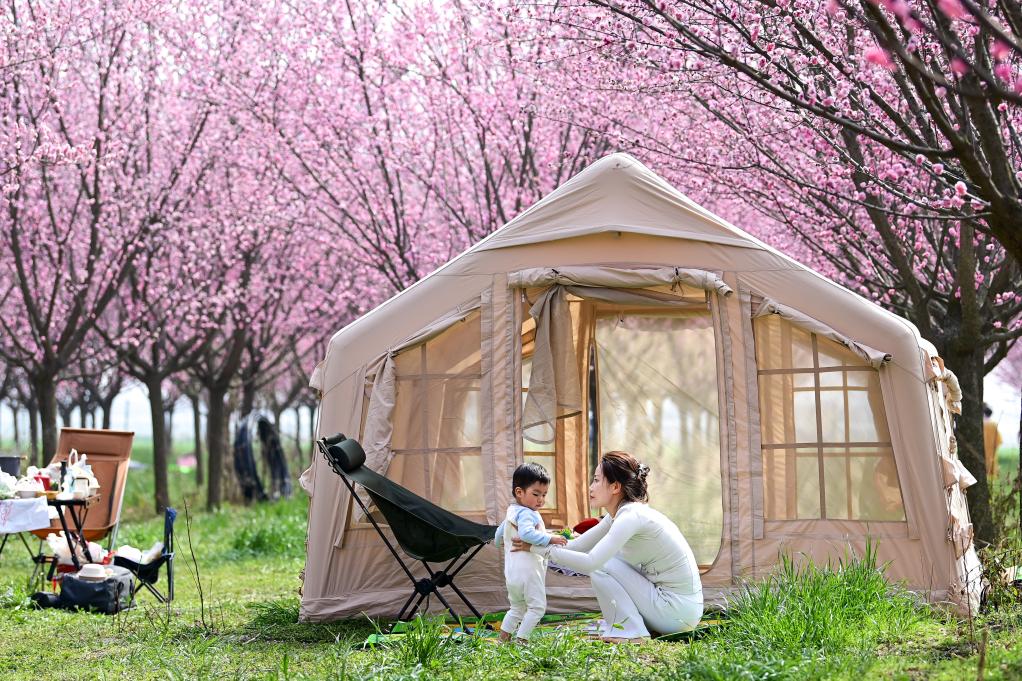 3月11日,游人在西安市鄠邑区甘河街道丁村梅花种植园内休闲。