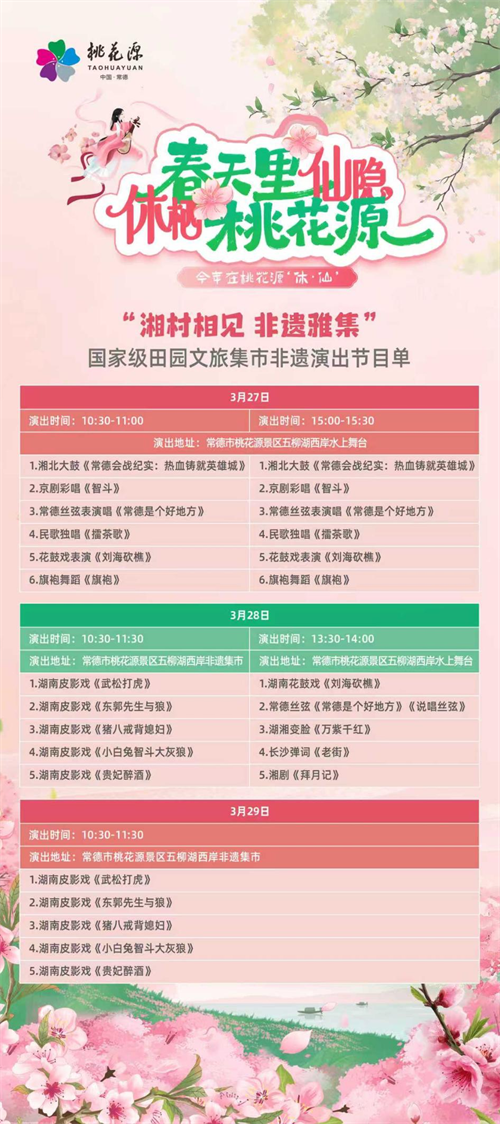 2026年3月27日至29日,作为2026桃花源文化旅游节的配套活动,“湘村相见 非遗雅集”——国家级田园文旅集市将在湖南常德桃花源景区五柳湖西岸诗意登场。