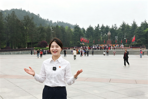 罗萍在毛泽东同志故居前为游客讲解。(李新辉 摄)