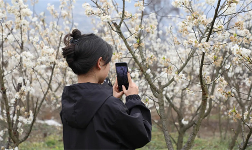 游客们穿梭于花林之间,或驻足观赏,或举起手机记录着美好瞬间,欢声笑语在花海中荡漾,“我们是特地赶来看樱桃花的,漫山遍野都是白色,开得太美了!”正在花丛中拍照的游客黄女士难掩兴奋——“随便拍一张都能做屏保,感觉春天的气息扑面而来。”