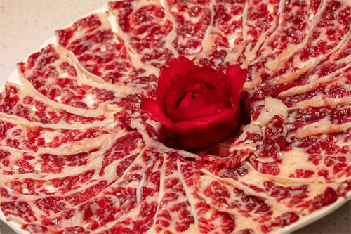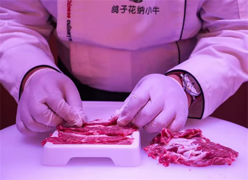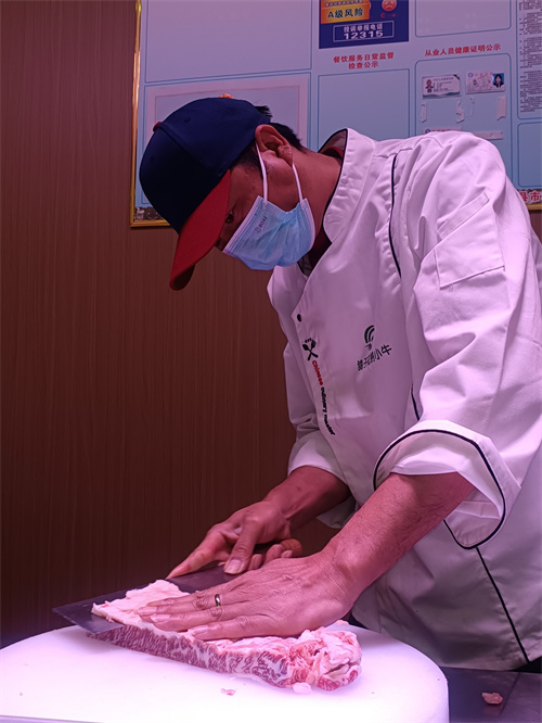 专门从潮汕地区请来的大厨一边仔细地切着牛肉,一边告诉六大河栏目记者:该店使用的牛肉与其他餐馆的完全不一样,牛肉全是公司基地上自家饲养的安格斯牛,肉质细嫩,肉味鲜美,使用流行的潮汕牛肉烹饪方法,像这种上好的雪花牛肉,甚至可以生吃。客人如有需求,吃完了想要带走哪个部位的牛肉,店里都可以提供。