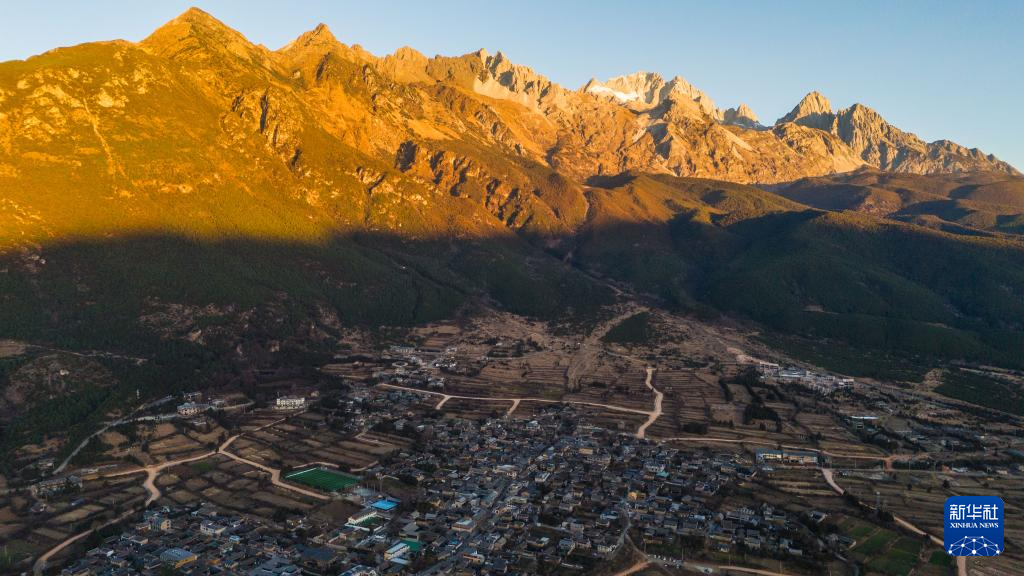 这是1月18日在丽江市玉龙纳西族自治县白沙镇玉湖村拍摄的玉龙雪山日出景色(无人机照片)。